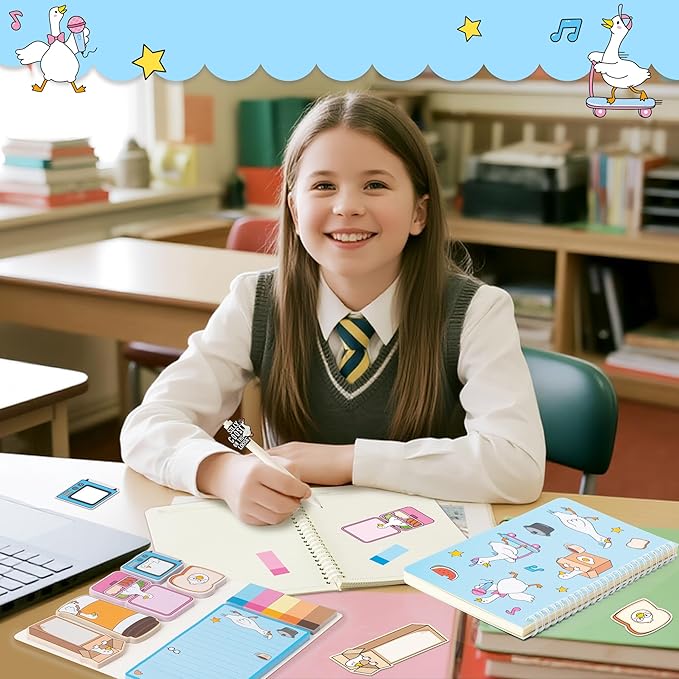 B1ykin Stationery Gift Set - 3Pcs Notebook Sticky Notes, A5 Spiral Notebooks & 550 Sheets Cute Sticky Notes with Pens Kit for Office School Teacher Thanksgiving Supplies (Funny Goose)