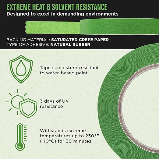 - Extreme Heat & Solvent Resistance: Designed to excel in demanding environments, this tape withstands extreme temperatures up to 230°F (110°C) for 30 minutes, making it ideal for paint baking cycles in spray booths and the use of infrared heat lamps. Its natural rubber adhesive and waterproof green backing also provide exceptional solvent resistance to resist paint bleed-through. The tape is moisture-resistant to water-based paint and offers 3 days of UV resistance.
