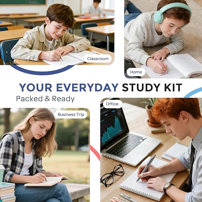 - All-in-One 50 PCS Stationery Kit - Covers Every Writing, Drawing & Highlighting Need:This comprehensive set includes 12 pastel highlighters assorted colors, 6 professional mechanical pencils (mix of 0.5, 0.7, 0.9 and 2.0mm tips to fit precise writing, sketching, and drafting), 5 black ink gel pens + 5 extra gel pen refills, 3 erasers + 18 cap eraser refills, 200 lead refills (2H/HB/2B/4B), and a black pencil pouch. Back to school essential for college students, teachers, and office professionals