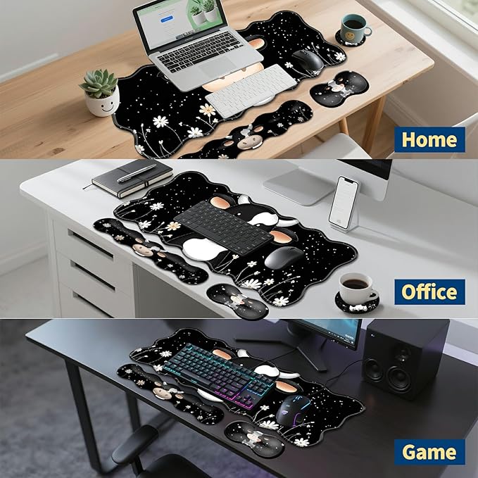 4-Piece XXL Gaming Mouse Pad Set (31.5"x11.8") with Keyboard Wrist Rest,Mouse Wrist Support & Coaster,Ergonomic Non-Slip Desk Mat for Office & Home,Cute Black White Cow