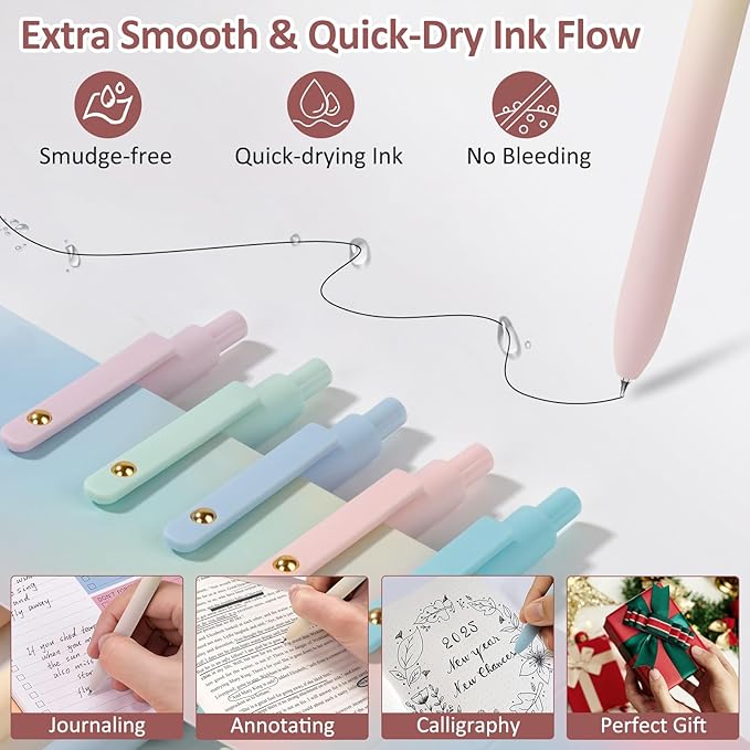 - Quick Drying Ink:6Pcs high-quality gel pens feature reliable ink that won't fade or smudge easily. Quick-drying ink with a large capacity ink compartment keeps the paper clean and does not leak, providing you with long-lasting writing time. These black ink pens are also suitable for lefties