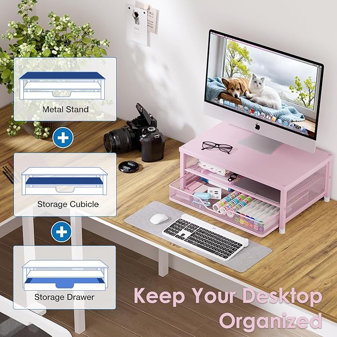 OPNICE Computer Monitor Stand Riser, Desk Organizers and Accessories with Drawer, Laptop Stand, Office Desk Accessories & Workspace Desktop Organizers Storage for Office Supplies(Pink)