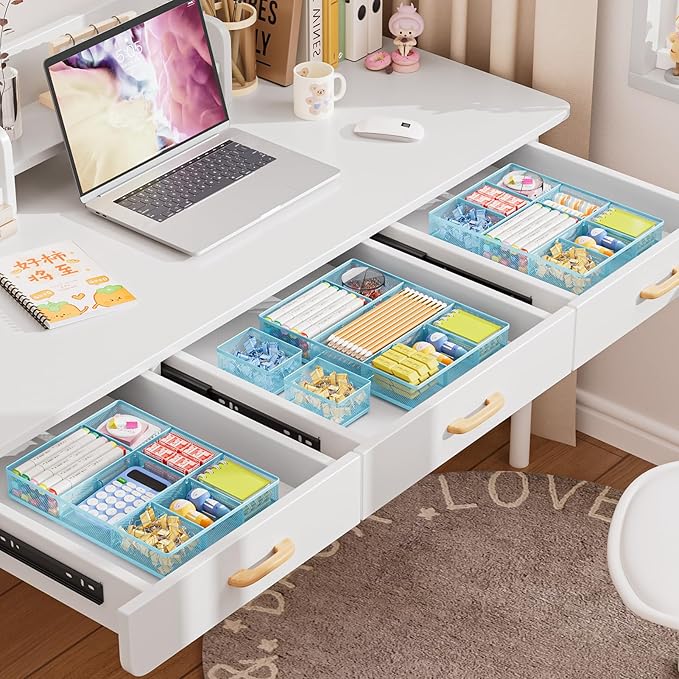 Marbrasse 3 Packs Desk Drawer Organizers, Metal Mesh Dividers with 9 Adjustable Compartments, Pen Organizer for Drawer Tray Box Accessories for Desktop,Kitchen, Makeup(Blue)