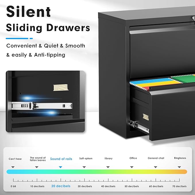 - ♚【Smooth & Silent Rails】Pataku 2 drawer black filing cabinets have smooth rolling bearing drawers, which make the sound of pulling the drawers less than 20 dB to maintain a quiet office atmosphere. The hanging rod in the drawer can effectively sort all kinds of files and keep them clean and tidy.
