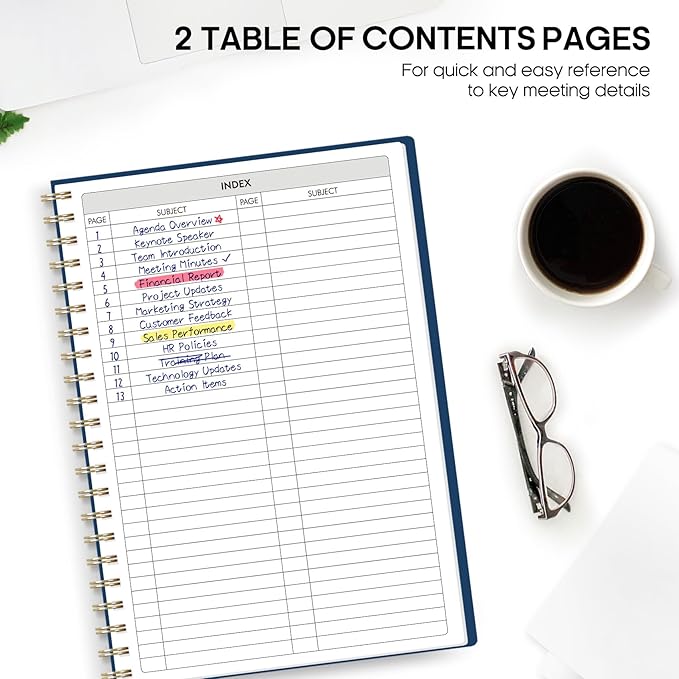 - Enhanced Organization And Efficiency - The thoughtfully designed layout of the meeting notebook helps you stay organized during meetings. Easily record key details like date, location, objective, and attendees. Effortlessly plan meeting notes and capture action items. The notebook's professional table of contents allows easy categorization and quick access to specific information, enhancing overall efficiency and organization.