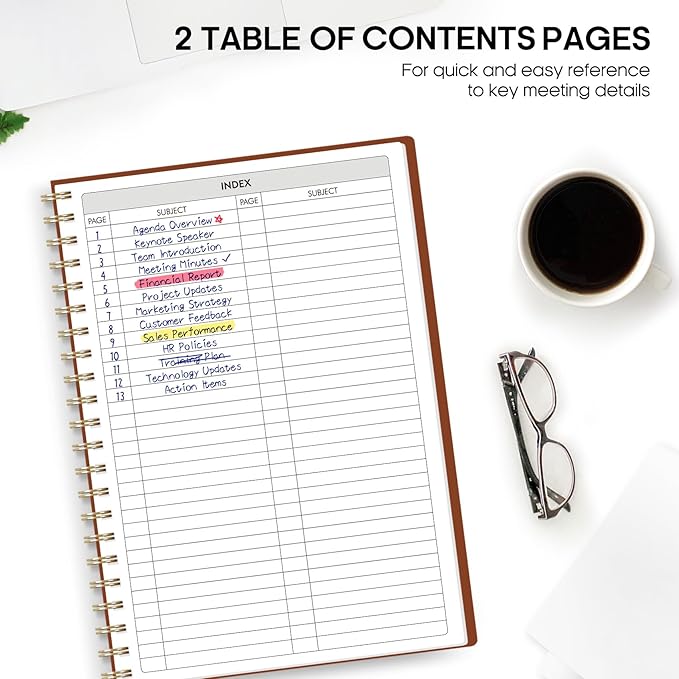 - Enhanced Organization And Efficiency - The thoughtfully designed layout of the meeting notebook helps you stay organized during meetings. Easily record key details like date, location, objective, and attendees. Effortlessly plan meeting notes and capture action items. The notebook's professional table of contents allows easy categorization and quick access to specific information, enhancing overall efficiency and organization.