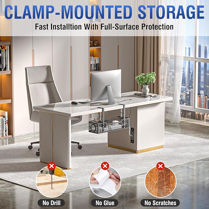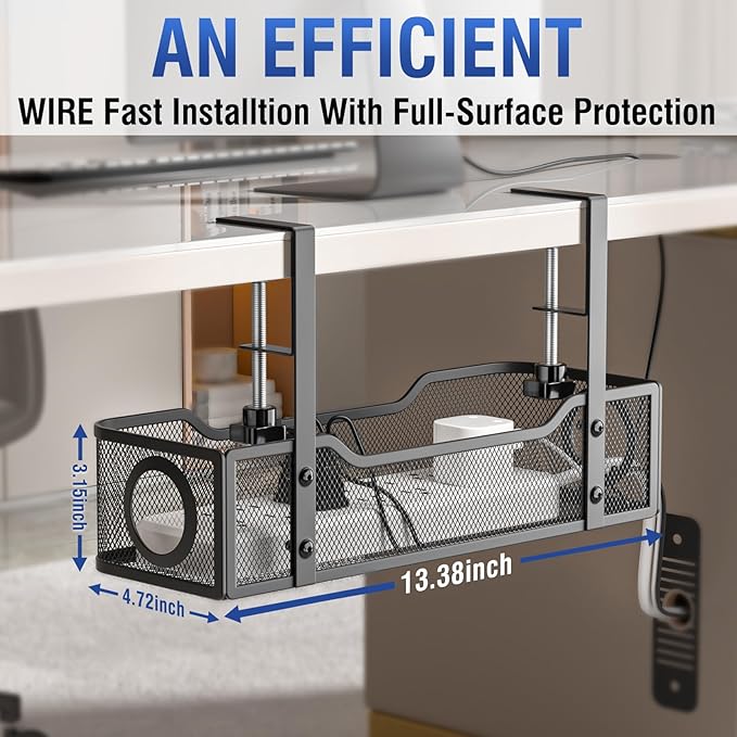 - 【No Drill Required】 Our cable management tray installs in three minutes or less using a simple clamp-on system. Anti-slip rubber pads protect your desk from scratches and damage. No drilling, adhesives, or permanent alterations are needed—making it safe for both home and office use.