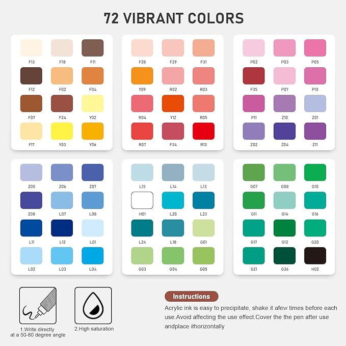 - π72 Rich Colors & Higher Saturation: This set of 72 acrylic pens features an upgraded ink formula, providing highly saturated colors that produce vivid and bright hues. Compared to traditional acrylic pens, these pens offer more authentic colors that perfectly replicate the desired tones, making them ideal for painting, writing, and various creative projects. Whether you're an artist, or casual enthusiast, you'll find the right colors for your needs.