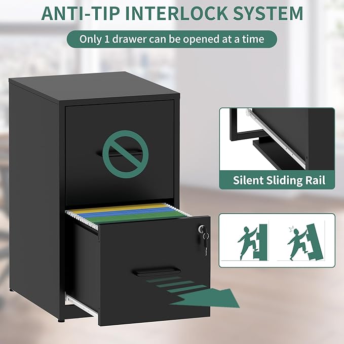 - 【HIGH SECURITY】This filing cabinets for home office with lock has one lock equipped with 2 keys securing all your files,you can lock all the drawers at the same time,with an anti-tilting mechanism, when one drawer of the narrow file cabinet is opened, the interlocking system prevents the other drawer from opening.