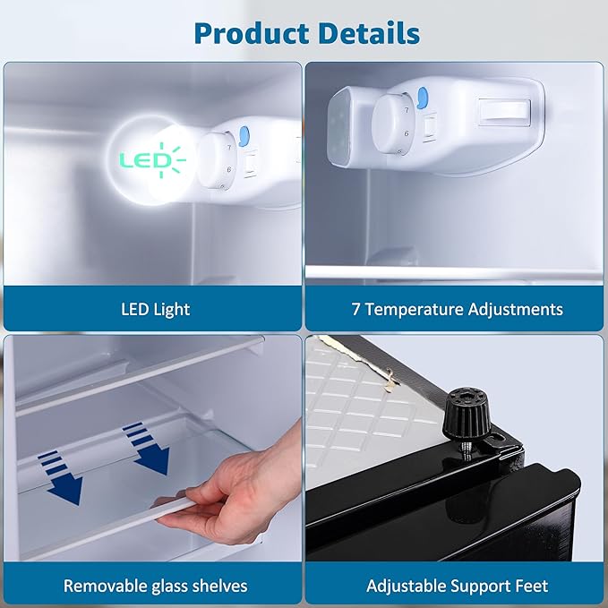 - 【7 Customizable Temperature Control】Our compact fridge with a freezer compartment offers a temperature range of -4 to 32°F for frozen items, ensuring they stay fresh. The refrigerator compartment maintains temperatures between 41 to 50°F. You can adjust the temperature settings from 1 (coldest) to 7 (warmest), with 3 being the optimal setting. This flexibility allows you to tailor the temperature to suit different food requirements.