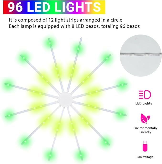 - 2025 Newest Christmas Window Lights: This Christmas light is composed of 12 light strips arranged in a circle, each light strip has 8 LED beads, a total of 96 beads. LED light strips can display multiple colors simultaneously on a line. The combination of colorful LED light strips creates a strong visual impact.