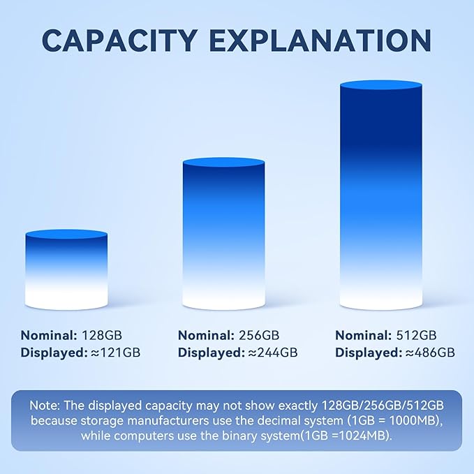 - 【128GB/256GB/512GB Large Capacity USB Storage】Choose from 128GB, 256GB, or 512GB to meet your storage needs. This iPhone memory stick helps free up space instantly, storing thousands of photos, videos, music, and documents. Ideal as a backup drive for iPhone and iPad, especially when your device runs out of storage. Note: The displayed capacity may differ from 128GB/256GB/512GB due to different calculation methods between storage manufacturers (1GB=1000MB) and computers (1GB=1024MB).