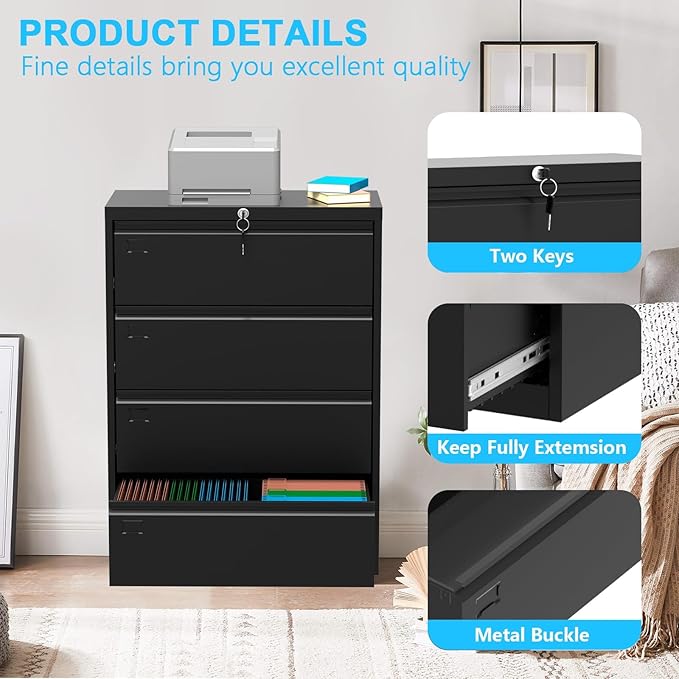 - Spacious 4 Drawer Design - Measuring 34.6''x15.7''x52.3'', this 4 drawer file cabinet fits legal, letter, and A4 documents with adjustable hanging bars. The wide lateral file cabinet maximizes storage, making it perfect for busy home offices.