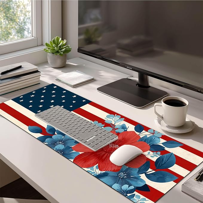 Mouse Pad 31.5 x 11.8 Inch American Flag Floral Desk Mat XL Large Extended Keyboard Mat Computer Desk Pad Non Slip Waterproof Mouse Pads Gaming Office Accessories