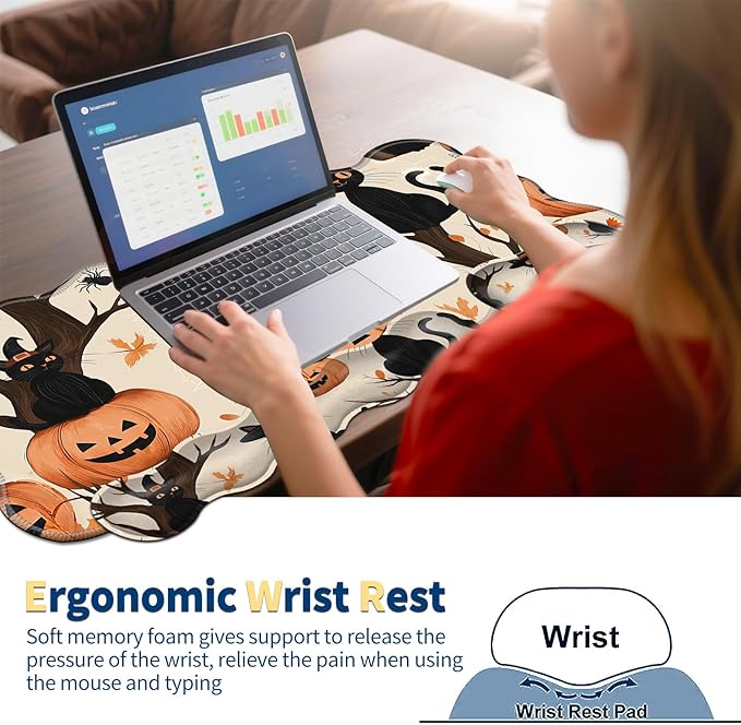 4-Piece XXL Gaming Mouse Pad Set (31.5"x11.8") with Keyboard Wrist Rest,Mouse Wrist Support & Coaster,Ergonomic Non-Slip Desk Mat for Office & Home,Black Cats Pumpkins