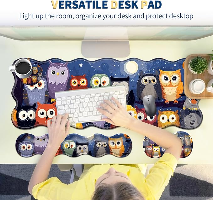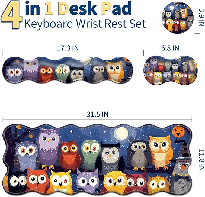 4-Piece XXL Gaming Mouse Pad Set (31.5"x11.8") with Keyboard Wrist Rest,Mouse Wrist Support & Coaster,Ergonomic Non-Slip Desk Mat for Office & Home,Colorful Night Owls