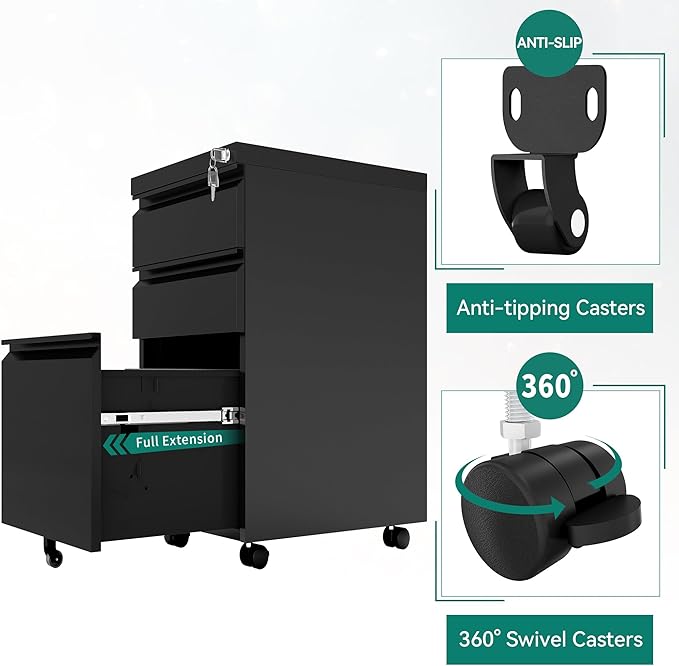 - Free-range Mobility with 5 Casters: This lockable filing cabinet has 4 x 360°swivel casters + 1x anti-tipping central caster; Easy and safe to move! 360°swivel casters provide great mobility and the central caster prevents tipping.