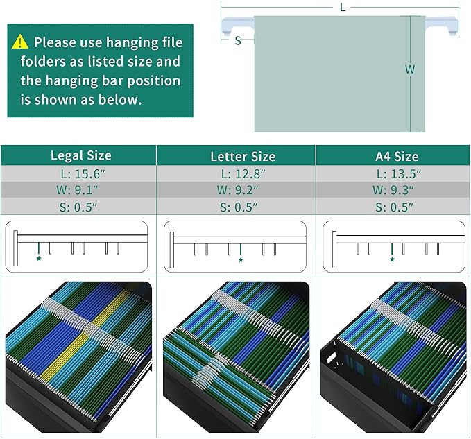 - Large storage drawer :Two drawer file cabinet provide large storage space, each drawer provides movable hanging bar, can allow letter size documents to be hung horizontally and vertically, legal and A4 size documents can only be hung vertically, not horizontally; Please carefully measure the size of your desk and documents before purchasing, so that you can better store and organize your documents.
